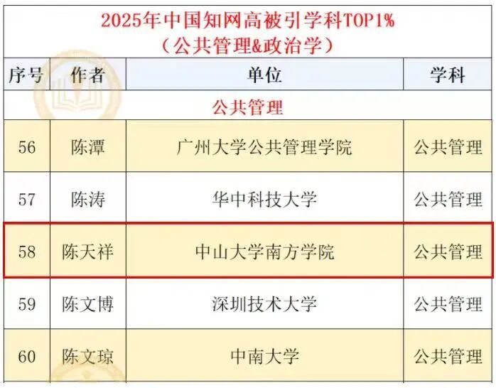 近日,CNKI中国知网正式发布“2025全国高被引学者”名单,公司共有四位老师凭借各自领域的突出实力成功入选,其中伟德国际victor1946的陈天祥老师(公共管理)跻身“2025全国高被引学者TOP1%”行列,伟德国际victor1946的王翔老师(公共管理)、王政老师(信息资源管理)以及图书馆的梁荣贤老师(信息资源管理)跻身“2025全国高被引学者TOP5%”行列。