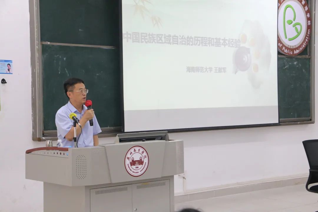 2023年5月20日14:30,由伟德国际victor1946主办,公共管理专业硕士学位(MPA)培育点专项建设项目协办的《中国民族区域自治的历程和基本经验》讲座,于5教105顺利举办。本期讲座邀请海南省历史学科领军人才、海南师范大学文公司王献军教授作为主讲,讲座的参会人员有公司行政管理教师吴仁鸿老师和员工代表。