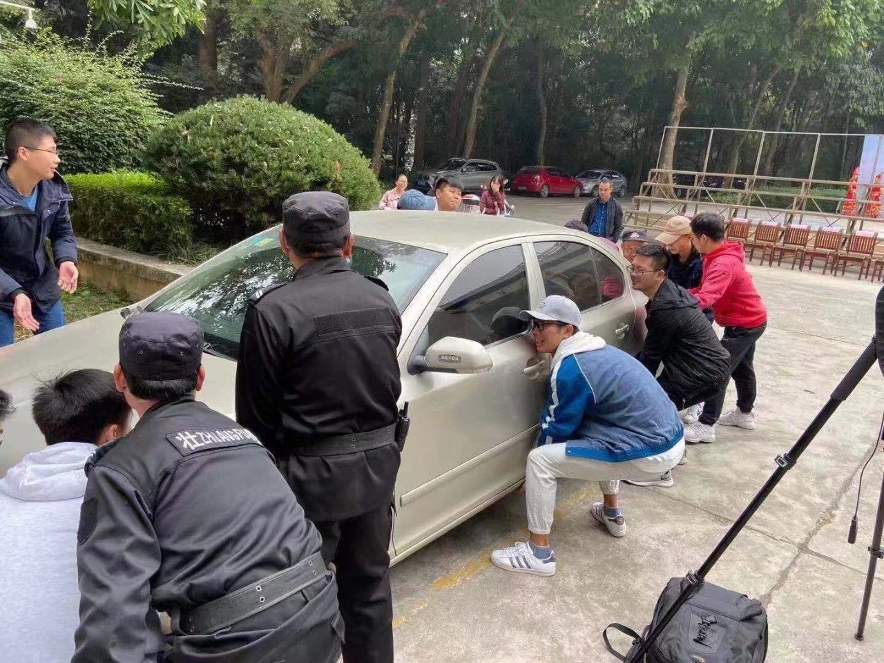 因停放车辆影响合影,会务组的工作人员齐心协力将停靠在拍摄地点的车辆搬运至其他地方,以便拍摄正常进行。这张照片集中、深刻地体现了以叶教授为首的团队兢兢业业办好会议的拼搏精神。