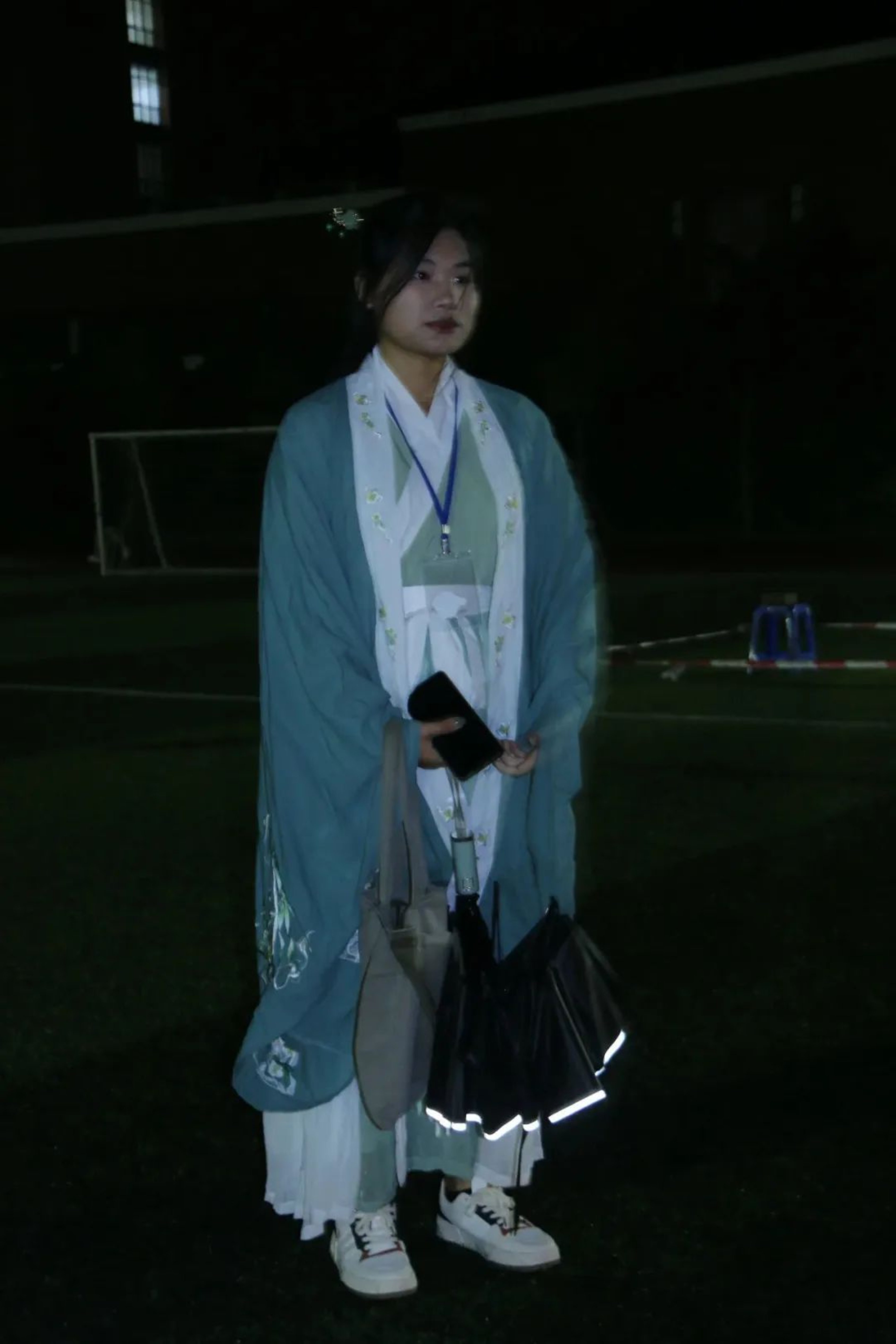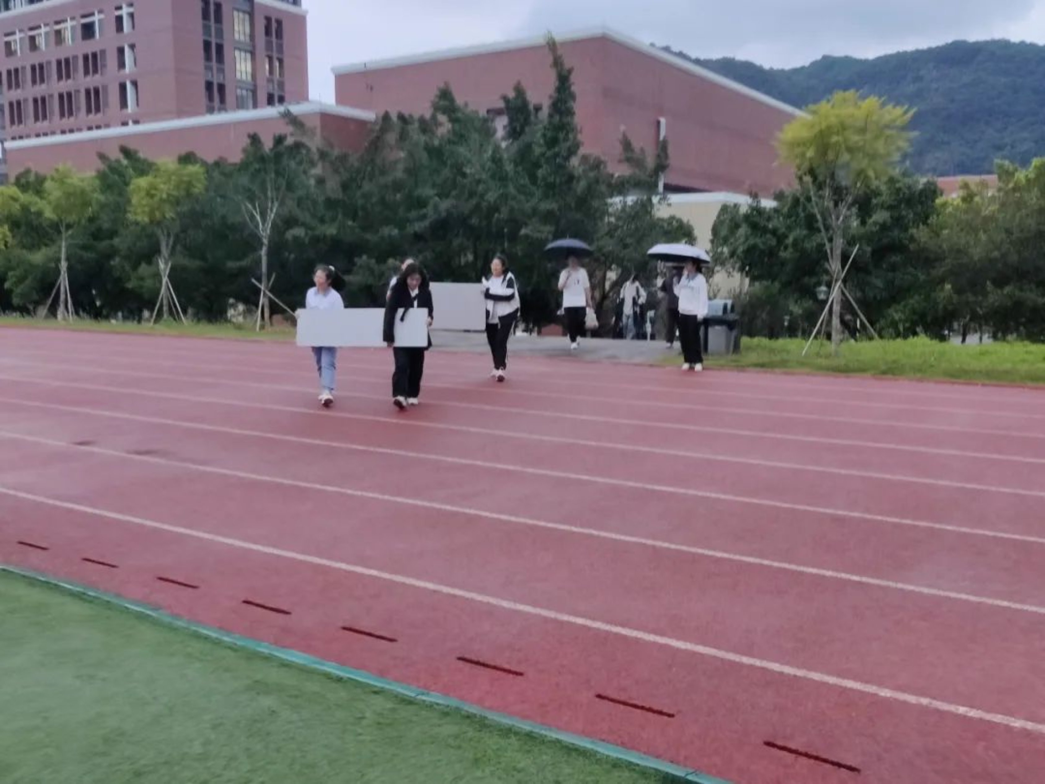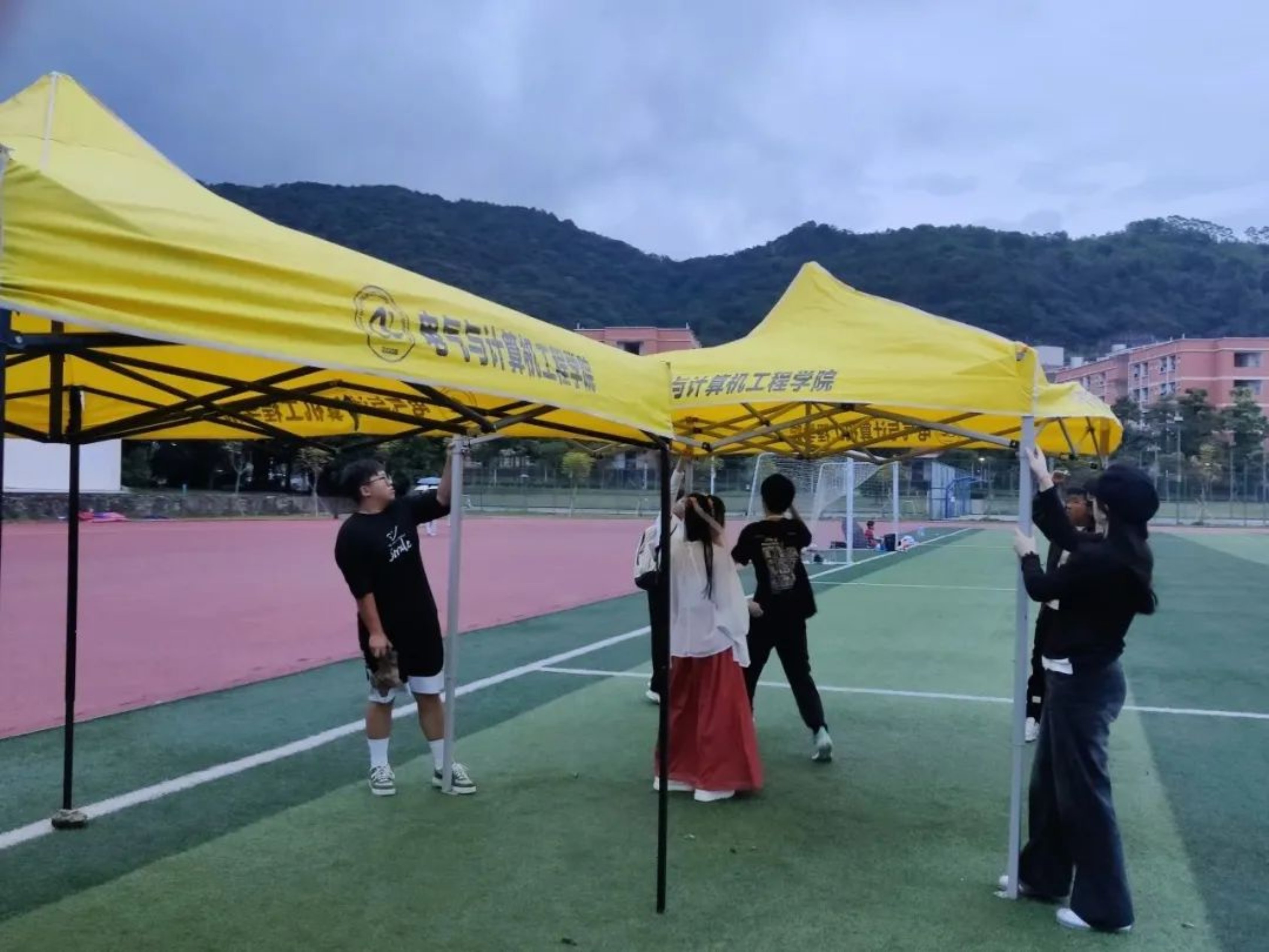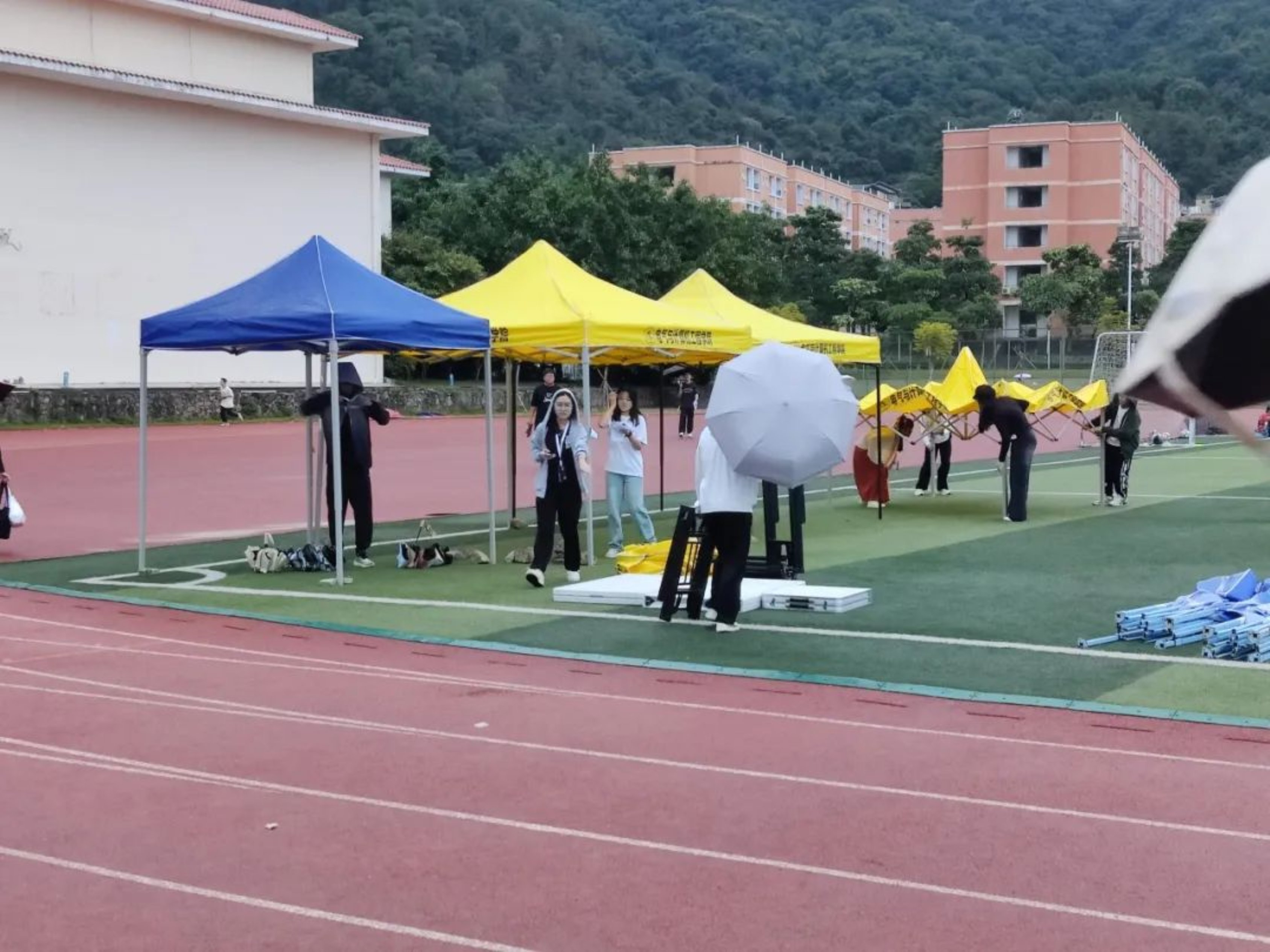 “天青色等烟雨,而我在等你。”晚上六点,工作人员在东区田径场摆放物资、搭建伞棚,天上飘落着丝丝细雨,为这场跨越千年时空的相遇添上一笔诗情画意,混着雨水的微风和我们一起等待同学们的到来。