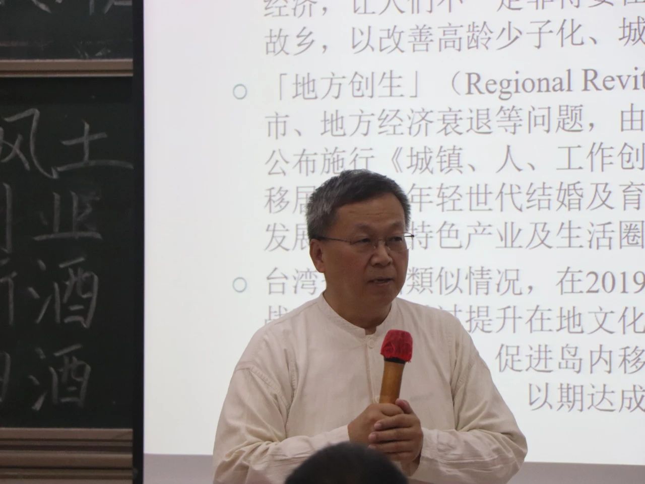 讲座开始,邱志淳教授先对讲座主题进行了介绍。地方创生即指目的在于发挥地方特色,发展出最适合的在地经济,让人们不一定非得要在都市工作,能够选择其他乡镇或回到自己的故乡,以改善高龄少子化、城乡发展不均等问题。旧瓶装新酒即指用旧的形式表现新的东西。新瓶装旧酒即指用新的形式表现旧的东西。