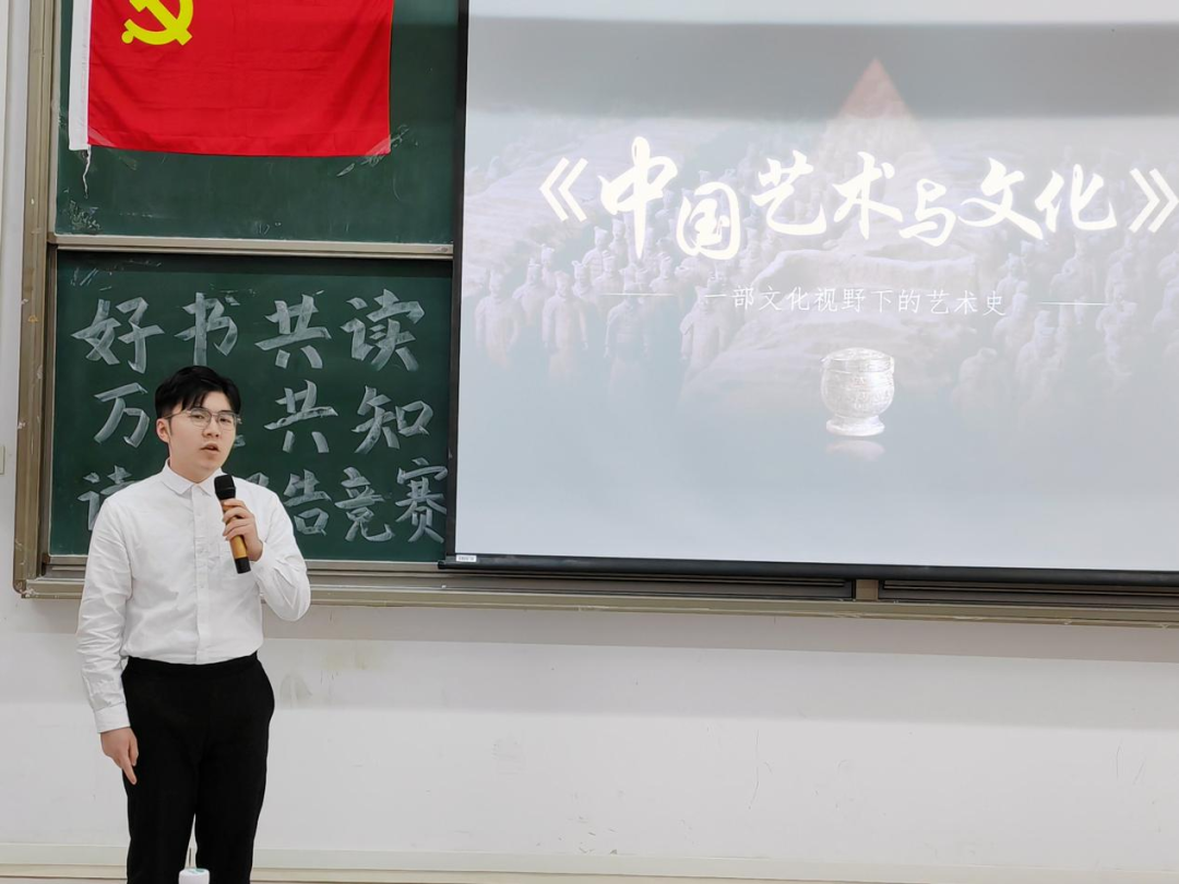在读书报告比赛中15名参赛选手依次登场,分享自己阅读的优秀书籍,让在场的同学与嘉宾共同体验了一场文学盛宴。其中,陈烨同学分享了《中国艺术与文化》这本书,书中以跨越时空的方式揭开艺术品背后存在的社会观念、文化价值、风土人情,从而去触摸古人生活,探析古人思想,纵观中国历史文化。陈烨同学表示,阅读这本书在潜移默化中激起了自己探索艺术的兴趣,体会艺术与文化结合的乐趣。