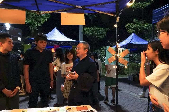 公共管理学系系主任陈天祥教授与各院系专业的老师们莅临了游园会现场,在文化产业管理专业的同学以及文州洲工作室成员们的指引下参与到游园会各个摊位的参观游玩之中,陈主任对本次活动作出了高度的评价,为筹备这场活动的师生们给予了极大的鼓励和支持。
