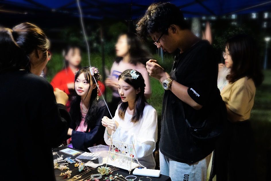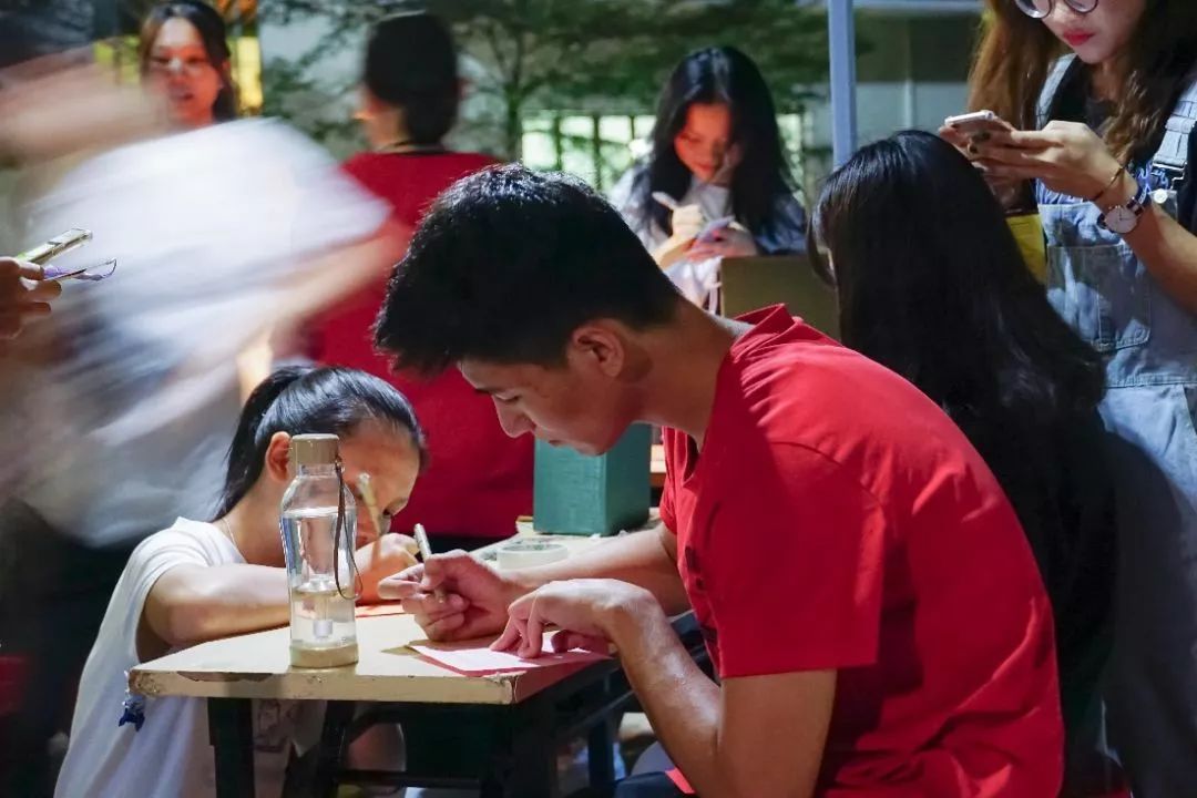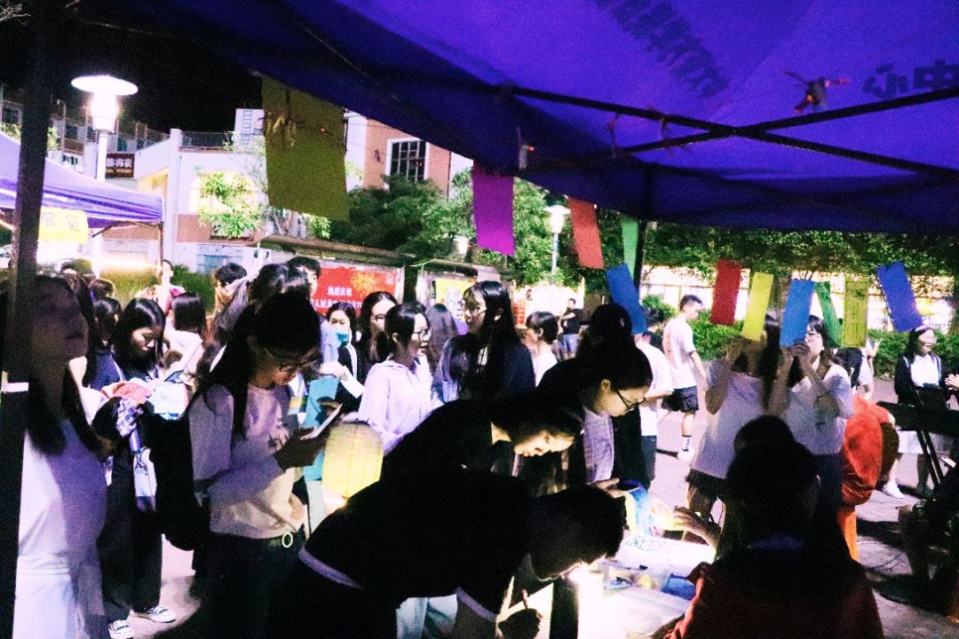 在摩肩接踵的人群中看到了猜灯谜和写彩虹屁的摊位,冷知识和彩虹般的花式吹捧紧紧抓住了同学们的好奇心,大家忘怀地沉浸在竞猜和花式夸奖中乐不思蜀。