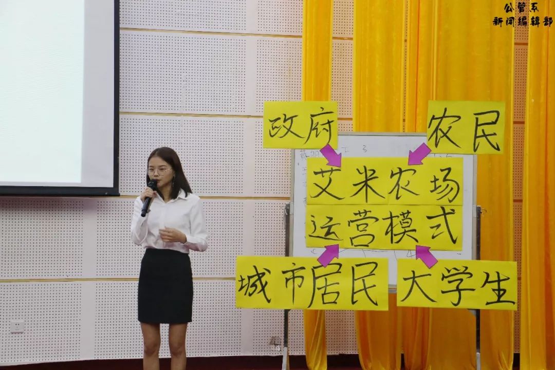 第四组李佳婷小组的主题是现代农业科技化的共享之“稻”考察。该组成员以分析艾米农场的运营模式为核心,结合农民、城市居民、政府、老员工四大相关主体提出课题研究假设,并从不同主体出发通过实地研究分析了艾米农场运营模式的局限性,总结出艾米农场的进一步发展不仅要依靠科研人才的付出,还需要有政府的大力支持!