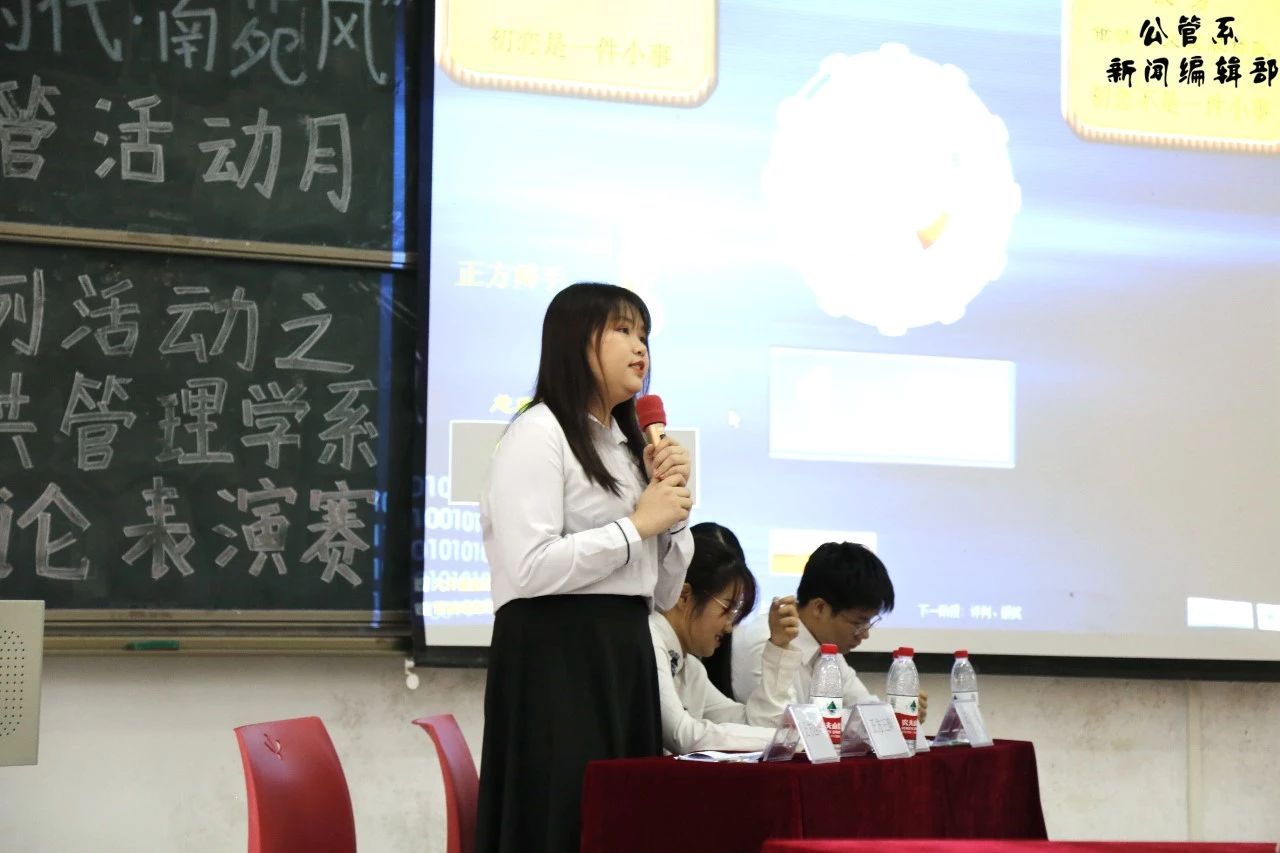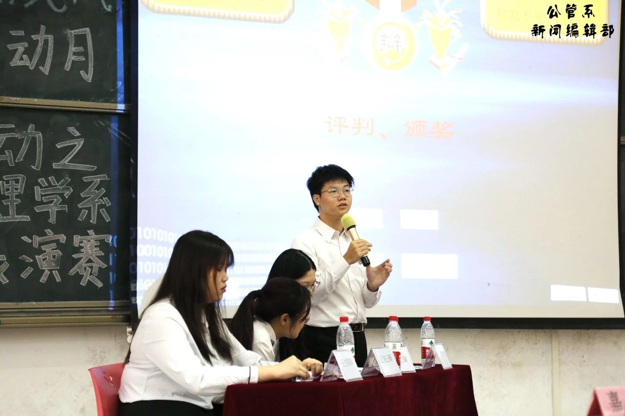 9月25日下午,由我系学习部举办的辩论表演赛在6教106举行。莅临本场比赛的嘉宾分别是:公管系团总支书记杨航老师、17级辅导员吴清远老师、19级辅导员赖昀充老师、团总支副书记凌晨奕同志和员工会主席邓秋仪同学以及公共管理学系员工会主席团成员。