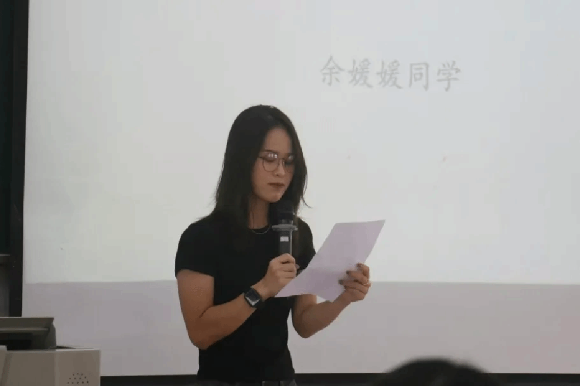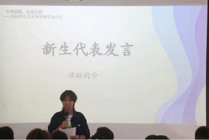 在新生代表发言环节,三位新生代表依次登台发表演讲。谭颖同学分享了她对老员工活的热切期待。“老员工活是充满挑战和机遇的,希望我们能够互相支持,共同成长。”陈晓彤同学则注重谈论她对公共关系学的认识与期许。“我也相信,只要我们保持热情,努力追求,就一定能在公共关系的领域中找到自己的位置,实现人生价值。”余媛媛同学以昂扬自信的语调向同学们发出了激情号召。“从此刻起我们的人生半径开始扩大,以谦逊之心求知、以务实之态做事、以积极之姿成长。”