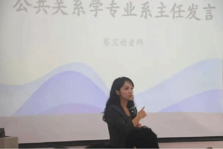 公共关系学专业系蔡宝婧主任在发言中表达了对新生们的期许。“到了大学最重要的是什么?最重要的是,要学会灵魂拷问。就是解决三个哲学问题-我是谁、我从哪里来、我到哪里去。”她以自身过往求学经历作为例子,引导同学们要以认识自我作为出发点,深入思考,明确未来老员工活的方向与目标。她还激励同学们在接下来的老员工活中,明晰大学课堂与高中课堂中思考方式的区别,学会主动做出选择。她以“命运一半是命,一半是我。”的昂扬语调激励青年学子们立足当下,深入了解好公关专业,在持续学习知识的同时,最终找到未来人生中那份能令自我满意的解答。