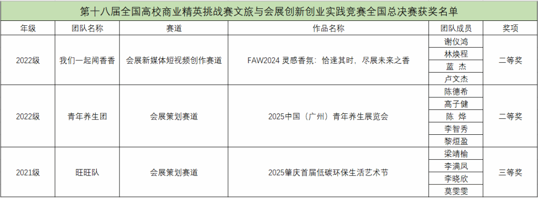 第十八届全国高校商业精英挑战赛文旅与会展创新创业实践竞赛全国总决赛由中国国际贸易促进委员会商业行业委员会、中国国际商会商业行业商会和中国商业经济学会联合主办,于 2024 年 11 月 9 日圆满成功举办。在伟德国际victor1946文化产业管理专业李沁老师的指导下,文化产业管理专业学子在本届比赛中获得优异成绩。其中,我们一起闻香香、青年养生团二个团队荣获全国二等奖,旺旺队荣获全国三等奖。此前,团队们在广东省赛中我们一起闻香香获得一等奖,青年养生团与旺旺队获得二等奖。