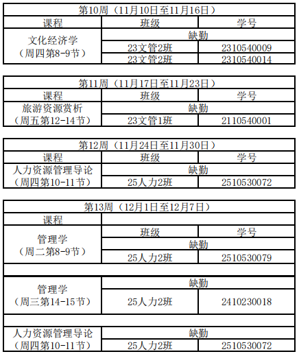 现将第十教学周至第十三教学周课堂考勤情况予以公布。本次考勤数据由伟德国际victor1946团委员工会系统收集、初步整理,并经各班级学习委员核对确认。所有结果在公司公示并审核无误后,将正式归档留存。如有同学对考勤记录存在异议或需核实情况,请于公示期内及时联系相应课程的学习委员,由学委统一向团委员工会监察部考勤负责人反馈。监察部将在接到反馈后核实处理,逾期不予处理。