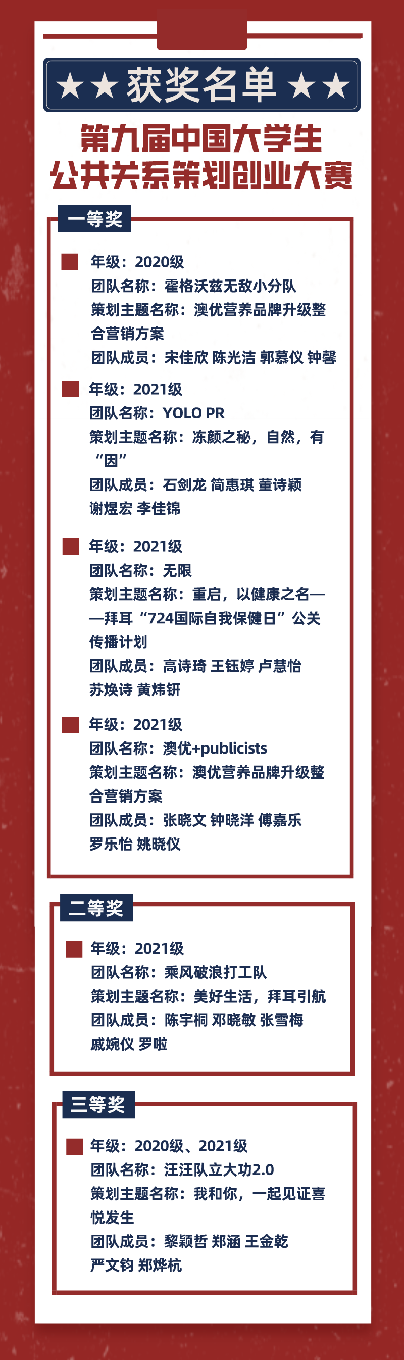在伟德国际victor1946公共关系学系老师的指导下,公司公关学子在本届比赛中获得优异成绩。其中,YOLO PR、霍格沃滋无敌小分队、无限、澳优+publicists四个团队荣获一等奖,将获邀参加第九届中国老员工公共关系策划创业大赛总决赛;乘风破浪打工队荣获二等奖;汪汪队立大功2.0荣获三等奖。