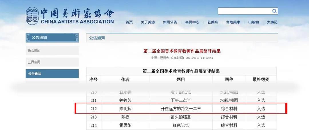 9月17日,由中国美术家协会主办,中国美术家协会美术教育委员会、四川美术公司承办的第二届全国美术教育教师作品展复评名单正式公布,昨日在四川美术公司美术馆(重庆市沙坪坝区大学城)开幕。此次展览面向全国高校从事美术教育工作及美术创作、艺术设计的高等院校教师征稿。公司伟德国际victor1946文化产业管理学系教师陈明辉的作品《开往远方的路之一二三》最终入选。