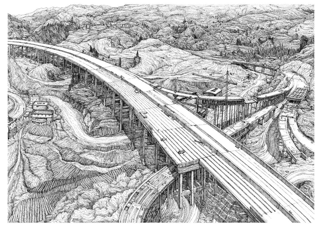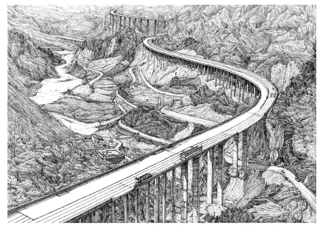 创作说明:画中描绘了黔东南高速、叙威高速、雅西高速的道路建设场景,场景中地势险峻、山峦重叠、地质结构复杂,中华儿女不畏艰辛完成了极其艰苦的工程,建造了开往更远更好的未来之路。