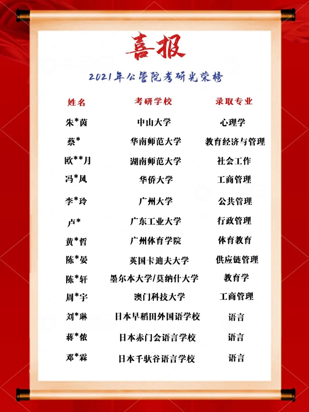 2021年,公司考研喜报频频传来。在公司领导的大力关心与支持以及全体师生的共同努力下,尤其是同学们自身的努力下,公司2021年考研上线人数创历史新高。据统计,截止5月26日,公司共考取国内外研究生13名。其中有7名同学考取国内知名院校并被录取,包括中山大学、华南师范大学、湖南师范大学、华侨大学、广州大学、广州工业大学、广州体育公司等院校;另外,有6名同学考取境外知名大学,包括世界排名第41的墨尔本大学、英国卡迪夫大学、澳门科技大学、日本早稻田外国语公司等院校。相较去年,公司考研成功人数有所上升,稳步提高百分比,考研录取人数占今年就业人数4.0%;录取公司有所提高,被“985”院校录取1人,被“211”院校录取3人;录取专业覆盖面也更加广泛,涵盖心理学、管理学、教育学等多种学科。