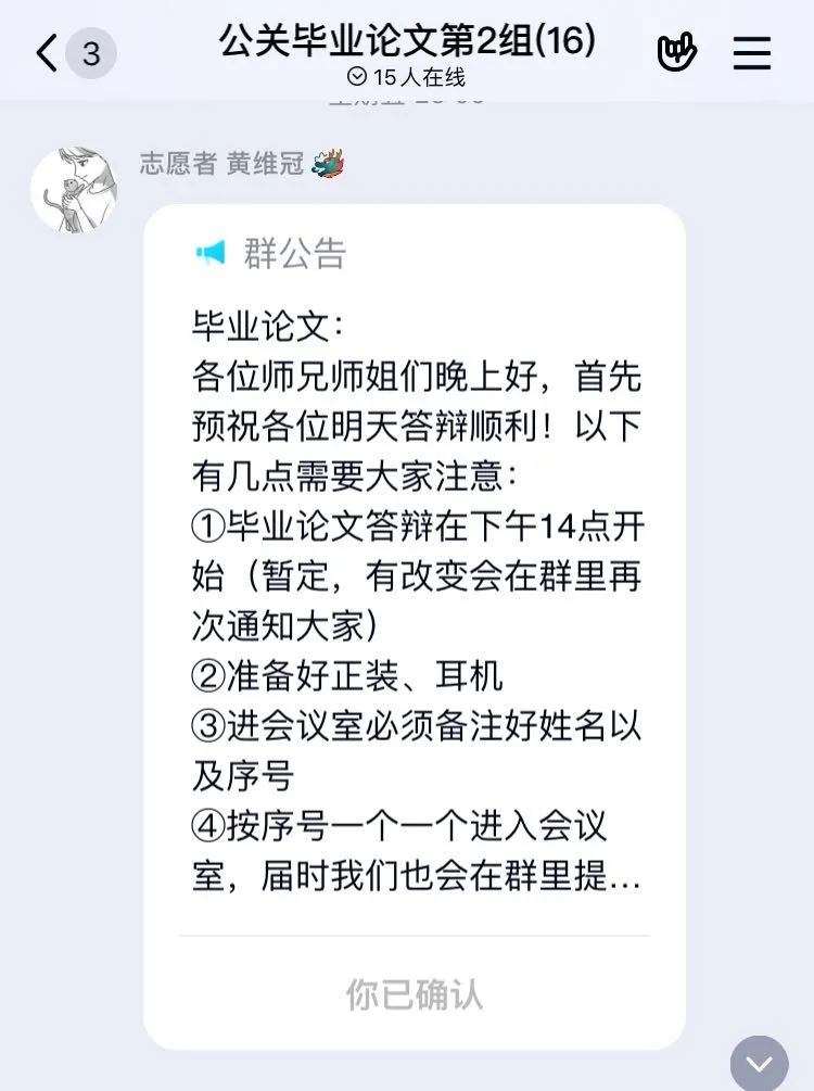 为确保2020届毕业生线上论文(设计)答辩工作的顺利进行,在陈天祥主任的带领和指导下,我系老师成立了答辩筹备小组:招募共计32名志愿者协助参与答辩、开展线上的培训会议,确认答辩细节及操作流程。