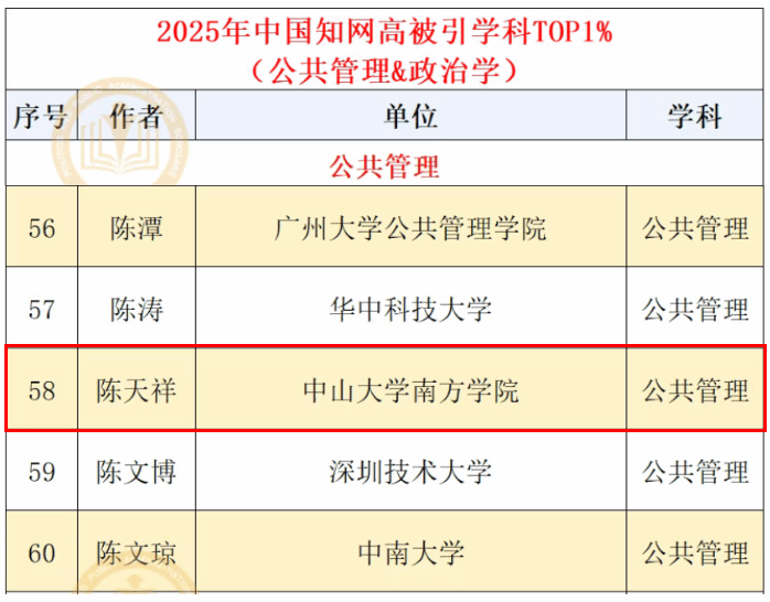 据悉,“中国知网高被引学者”遴选旨在客观、科学衡量并表彰近十年来国内科研成果丰富、学术影响力杰出的学者群体。本次榜单公共管理学科共有1206名学者入选TOP1%、2449名学者进入TOP5%。陈天祥教授连续两年入选榜单TOP1%,不仅是其个人科研实力与学术贡献的有力印证,也为公司的学科发展与学术声誉注入了新的活力。