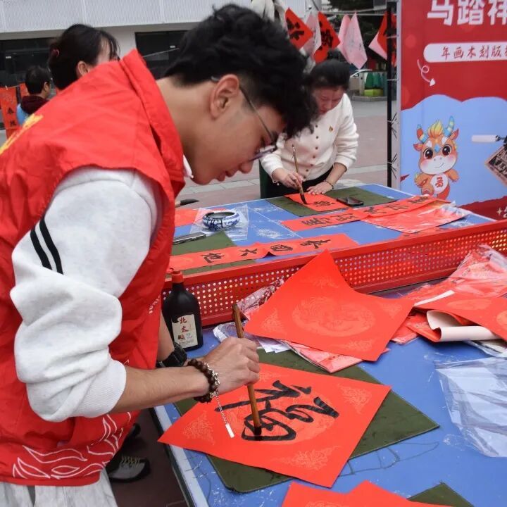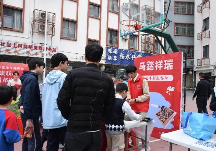 在"马踏祥瑞"摊位,小朋友们围拢在志愿者身旁,亲手体验传统木刻版画的拓印技艺。朱红颜料在宣纸上晕开,一匹匹承载着吉祥寓意的"骏马"跃然纸上,让参与者在墨香中触摸非遗文化的温度。