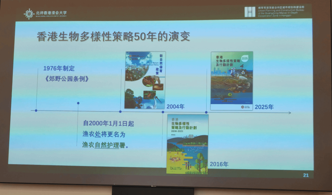 本次分享以"香港生物多样性保护策略50年的演变"为主线,勾勒出三阶段治理范式转型:1980年代民间NGO与高校自发调查奠基→2001年后政府系统建库与政策创制→2016年以降"主流化"战略与多元工具融合。核心制度创新包括:以计分制评估确定优先保育地点的机制(涵盖天然程度、栖息地多样性、物种稀有度等量化指标)、协调私人土地保护与开发的"管理协议"及"公私营界别合作"模式、50亿港元种子基金的杠杆设计、公民科学与AI技术的赋能应用,以及当前对接国家计划与全球框架的2035战略。