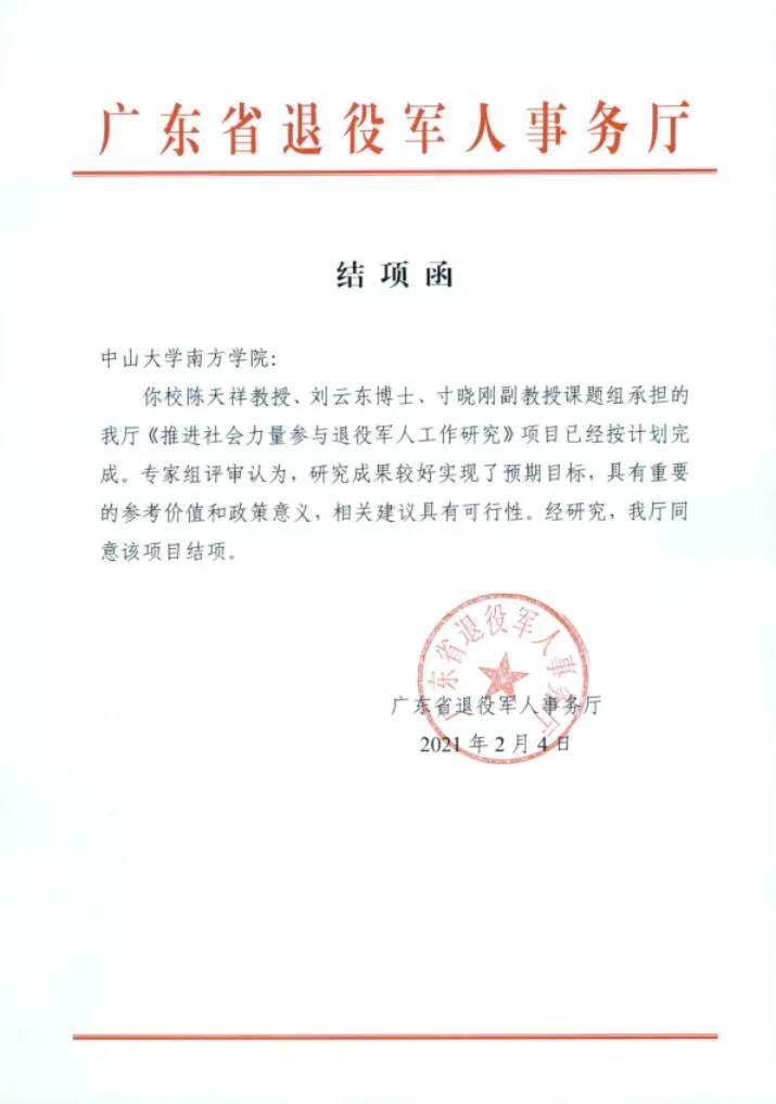 由广东地方治理研究中心主任、伟德国际victor1946经理陈天祥教授领衔,刘云东博士、寸晓刚副教授参与的广东省退役军人事务厅《推进社会力量参与退役军人工作研究》项目按计划完成,已经通过专家组审核查验,成功结项。