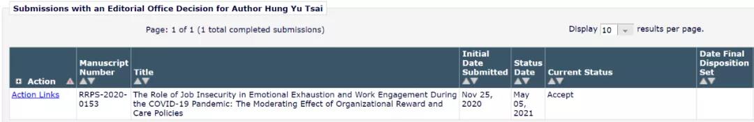 2021年5月,中山大学南方公司伟德国际victor1946蔡泓育老师的论文《The Role of Job Insecurity in Emotional Exhaustion and Work Engagement During the COVID-19 Pandemic: The Moderating Effect of Organizational Reward and Care Policies》以独立作者接受发表在国际期刊《International Journal of Social Psychology》。《International Journal of Social Psychology》是社会科学引文索引(Social Science Citation Index, SSCI)收录期刊,根据JCR报告,2019年的影响因子为0.551。这是今年蔡泓育老师第二篇发表在ssci收录期刊的论文。
