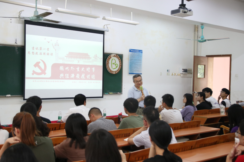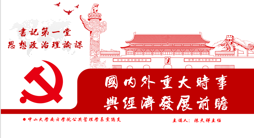 2019年9月17日下午四点,公共管理学系党总支书记、系主任陈天祥同志在7教103给我系员工开展了书记第一堂思想政治理论课。本次课堂围绕“国内外重大时事与经济发展前瞻”的主题进行讲授。党总支副书记、学工办主任陈利斌同志与员工党支部书记卢诗杰同志出席了本次思想政治理论课。