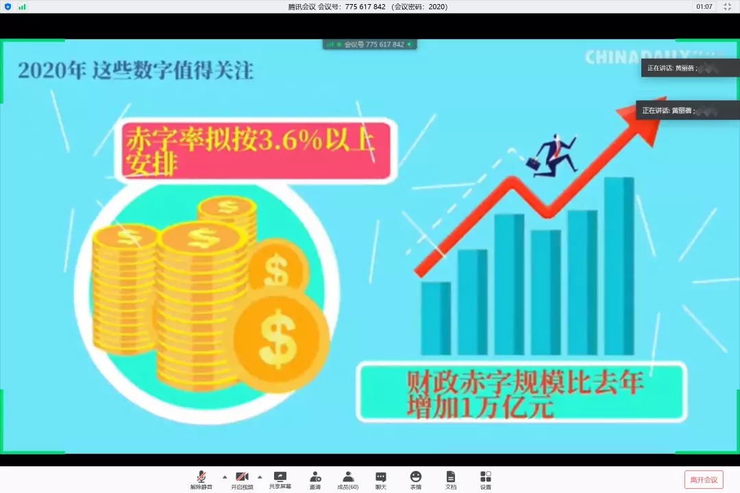 随后,全体同志观看相关视频,听国务院李克强总理作政府工作报告,回顾了2019年我国取得的巨大成就,了解到我国在2020年未来的展望。许多同志感触颇深,纷纷发表了自己的意见。其中黄宇凰同志连麦分享:“中国不断地在总结经验,努力改进不足,我们没有因为中国速度而沾沾自喜,相反还一直在回首过去,吸取经验,中国的崛起离不开这点点滴滴的努力。”以及欧阳慧月同志连麦表示:“此次两会让我印象最为深刻的是,政府报告中提到扩大高校面向农村和贫困地区招生规模,因为我本身也是来自农村,对这个点感受颇深。”