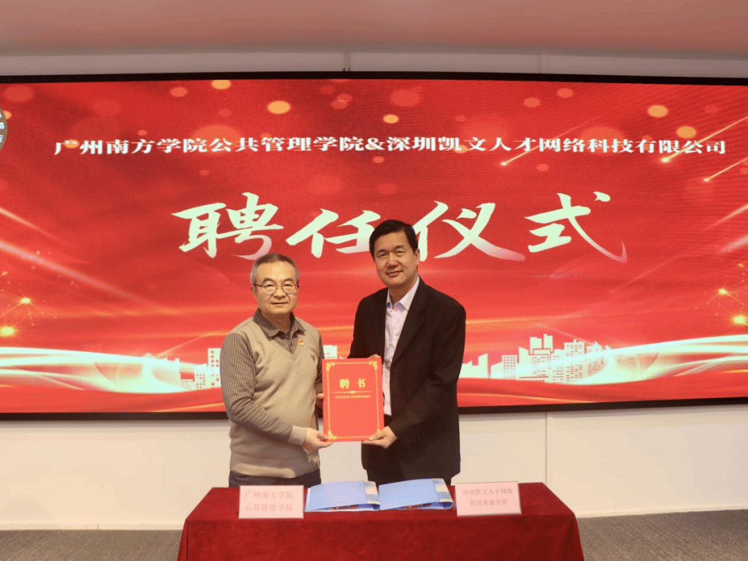 签约仪式后,现场举行行业导师聘任仪式。陈天祥经理代表公司,为深圳凯文人才网络科技有限公司创始人、董事长庞鹏先生颁发聘书,正式聘任庞鹏先生为公司行业导师,助力公司人才培养与专业建设,进一步深化校企协同育人成效。庞鹏先生接过聘书并表示,将认真履行行业导师职责,积极发挥企业资源优势,为公司学子成长成才提供助力。