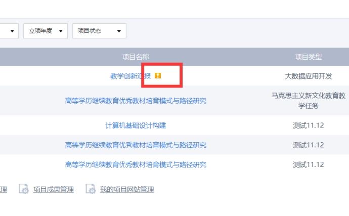 项目负责人可以在项目成果处登记项目建设中取得的成果,成果审核通过后将会在平台门户公示。也可以在我的项目列表下方,项目成果管理处,单独添加成果记录,不依托项目。