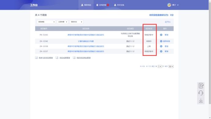 1. 当已通过申报评审的项目进入到中期、结题阶段时,对应项目会有提交材料的提示。