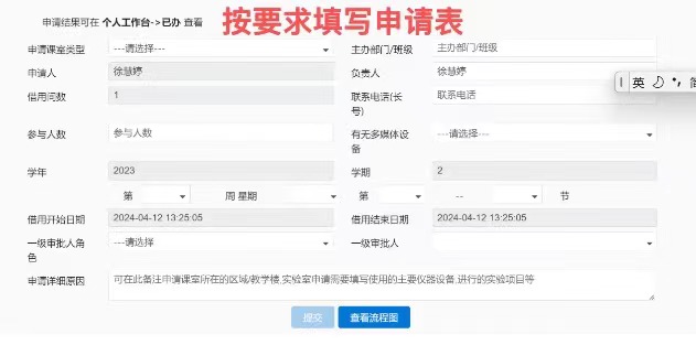 打开伟德国际victor1946数字校园→点击功能选择→点击员工申请→选择课室申请→填写课室申请表→在个人工作台中的已办查看结果