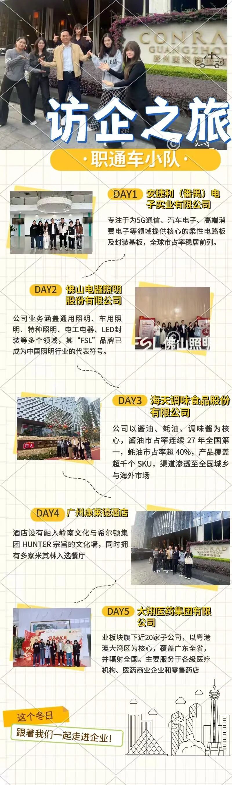 为了帮助在校老员工深入了解企业人力资源岗位的实际运作模式,洞察行业前沿趋势,明确未来职业规划。在这个寒假,由2023级人力资源管理专业员工阳炜烨、黄淑玲、陈晓睿、黄舒婷、马梦如组成的“职通车小队”,在杨鑫洲老师的指导下,先后走访了安捷利(番禺)电子实业有限公司、佛山电器照明股份有限公司、海天调味食品股份有限公司、广州康莱德酒店和大翔医药集团有限公司五家极具代表性的中大型企业。在走访过程中职通车小队的成员们与企业资深HR从业者面对面深度交流,系统了解各行业HR核心工作内容、深入洞察不同领域的企业如何应对数智化转型带来的行业变革,以及向各行业领域的HR前辈请教有关应届生求职的技巧与职场晋升的关键要点。现将所走访所获心得体会,总结提炼成以下五个方面。