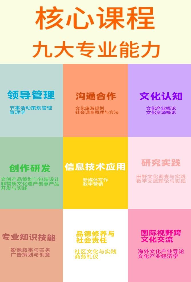 文化产业管理专业注重培养“富文化”“善经营”“强策划”“宽视野”的复合型文化创意与数字人文之多重能力人才,同时,专业注重构建“八能一任”九大专业能力培养体系,包括:“领导与管理能力”“沟通与合作能力”“文化认知能力”“创作研发能力”“品德修养与社会责任”“专业知识与技能”“信息技术应用能力”“研究与实践能力”“国际视野与跨文化交流能力”,其中“数字化技能”与“信息技术应用能力”形成时代性能力呼应,“社会责任感与职业道德”则与“品德修养与社会责任”构成价值导向与能力培养的双重支撑。